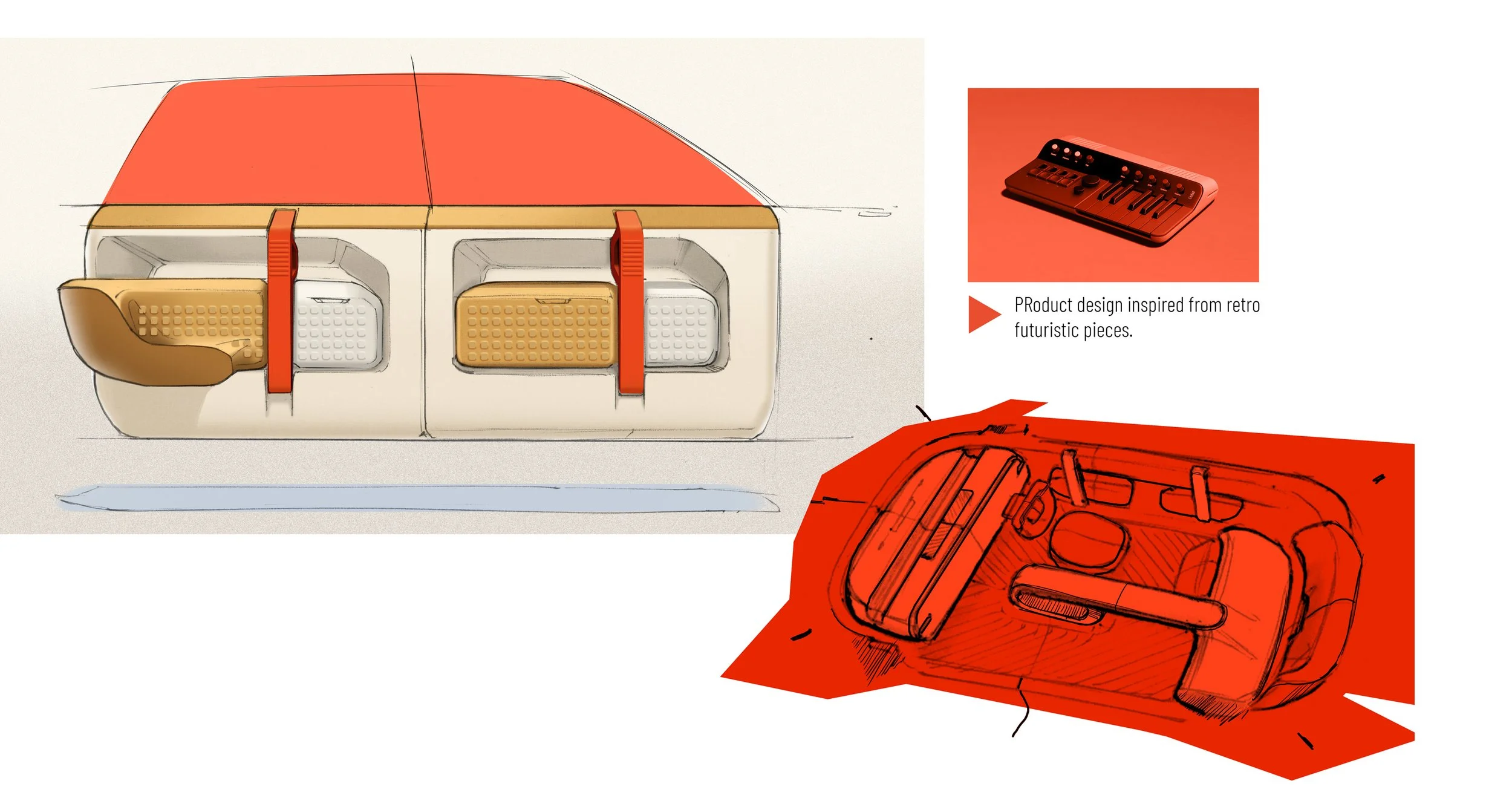 A modern “habitacle” or moving habitat, inspired by geometric design from the 1960s specifically fo rthe Olivetti Lettera typewriters. This is a personal project reflecting on the translation of the design elements of that era subtly integrated into a personal vehicle.